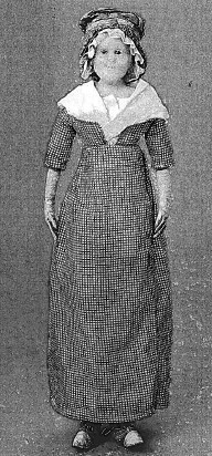 This doll was submitted through the V&A textile department. The head is said to be remarkable because it has the wrinkled face of an old woman, sensitively modelled. It is most unusual for a doll to have the face of an elderly adult, especially an adult who belonged to the lower classes as the dress suggests. Burton and Goodfellow believe it to be ‘a special commission, perhaps a portrait of an actual person – a servant or nanny.’ It was made in the early years of the nineteenth century.